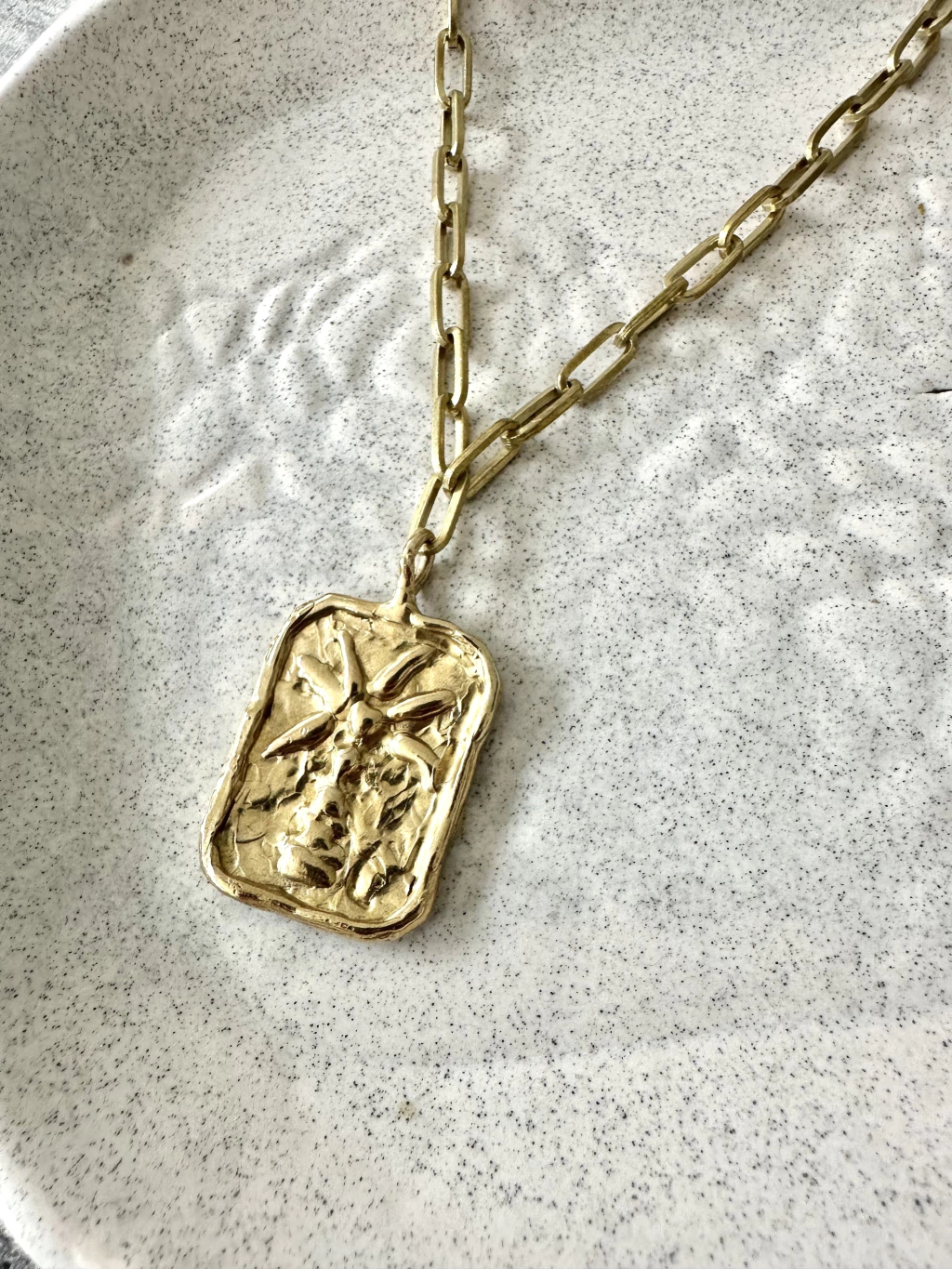Collar con cadena de bronce de 50cm con dije rectangular en el centro. Cierre con gancho infinito.